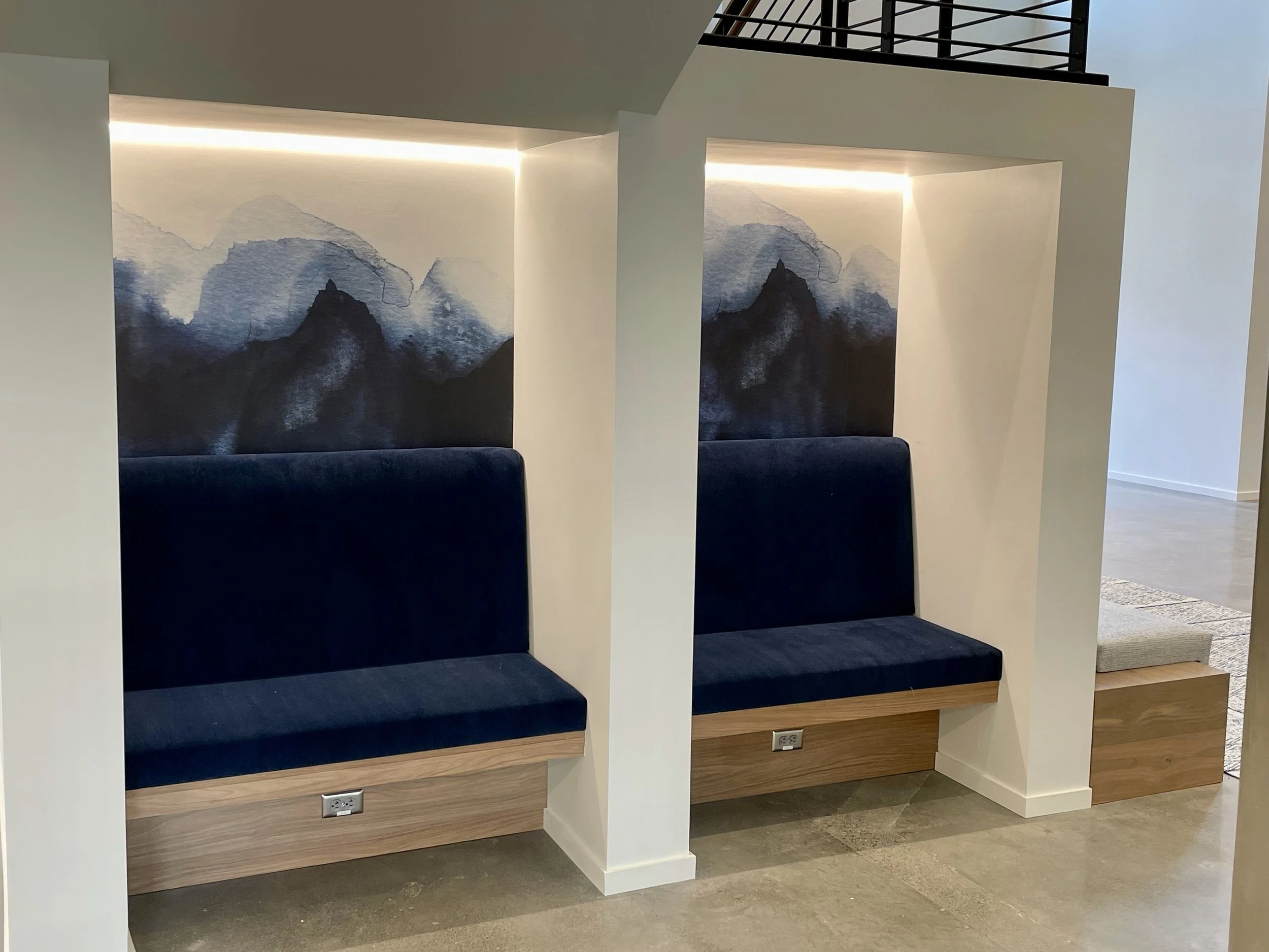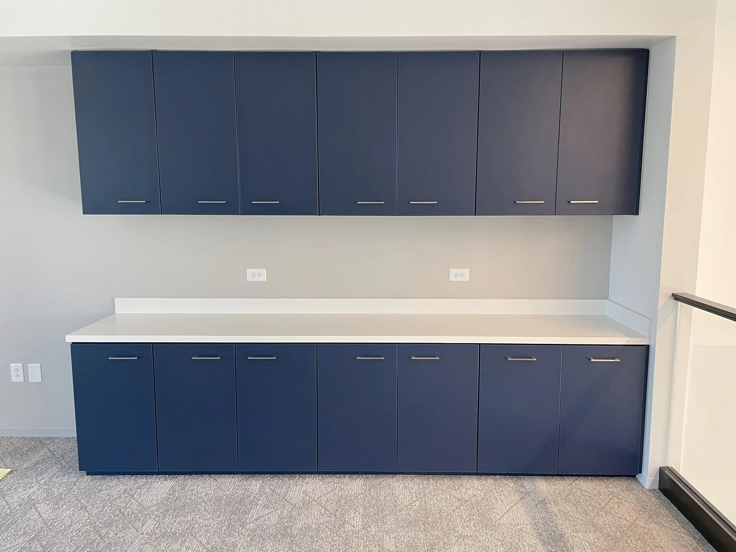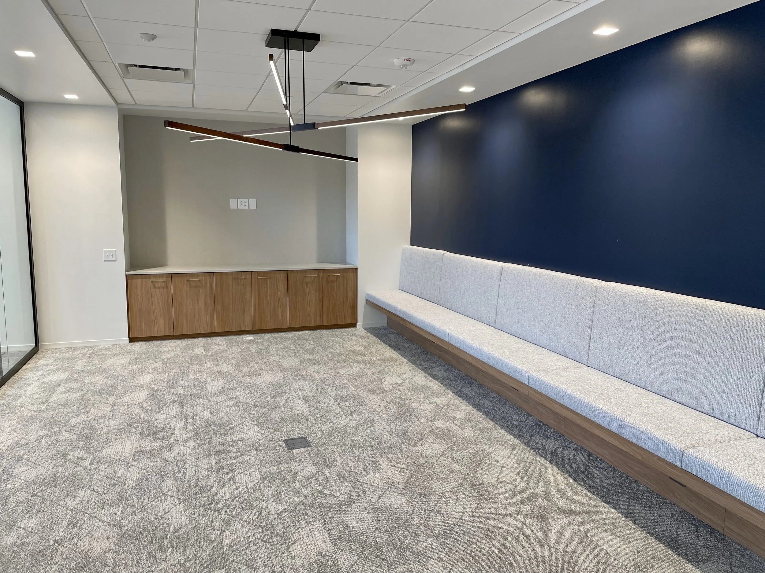 Breakroom office cabinetry and bench seating for spec office in Charlotte, NC