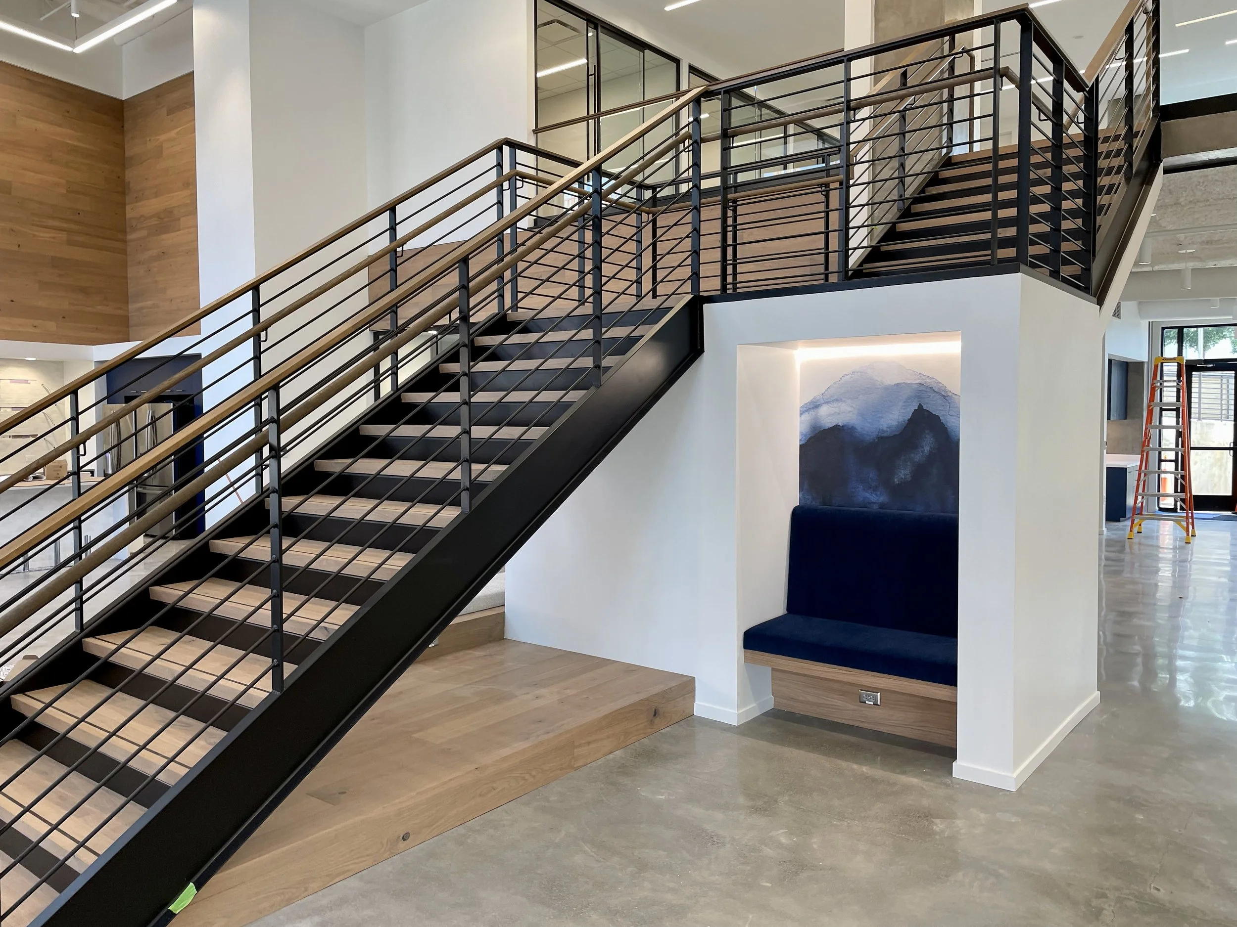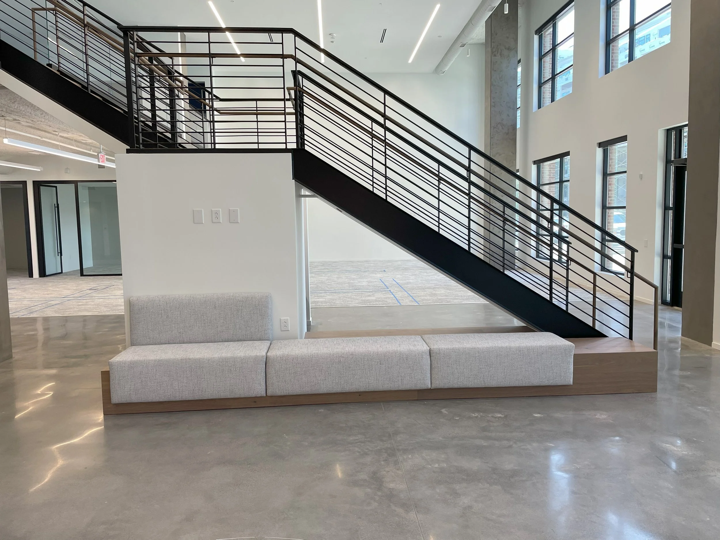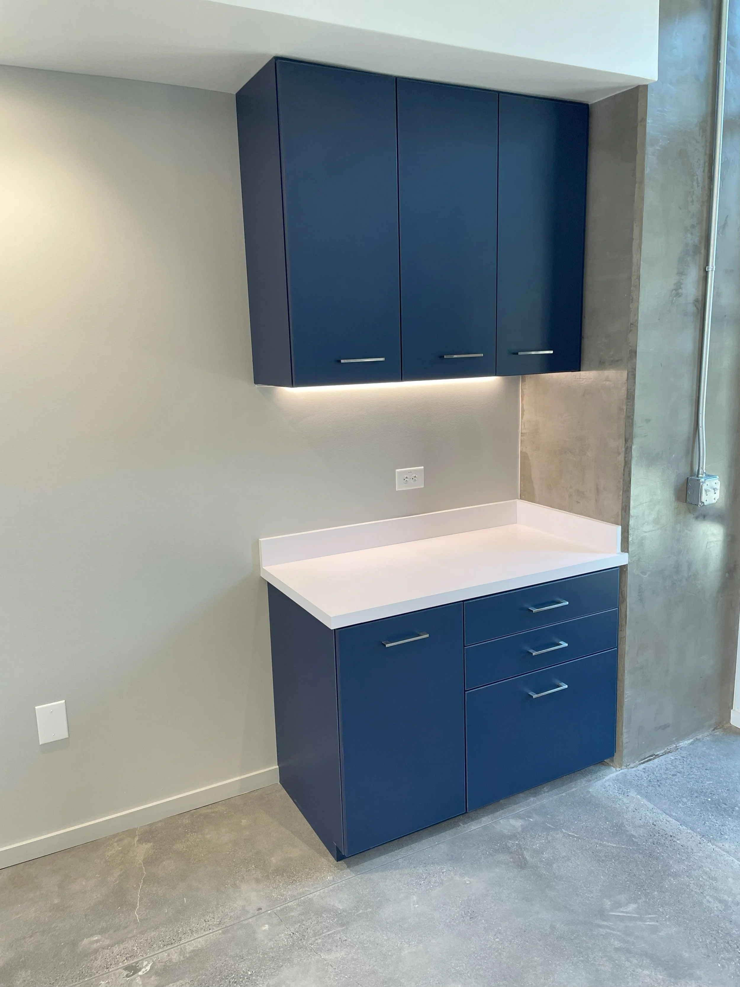 Breakroom office cabinetry and bench seating for spec office in Charlotte, NC